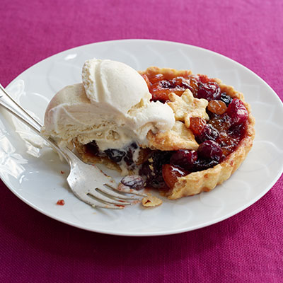 Heat oven to 375 degrees F. In a small bowl, beat the egg. Roll out dough scraps and cut out acorns and leaves. Divide the fruit mixture among the prepared tart tins (about 1/2 cup each). Top the tarts with the acorn and leaf cutouts and brush the cutouts with egg. Bake until golden brown, 25 to 35 minutes. Serve with ice cream, if desired.