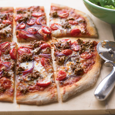 Cover mini pizzas with slices of plum tomatoes for a fresh take on a family favorite; sprinkle mozzarella cheese on top.