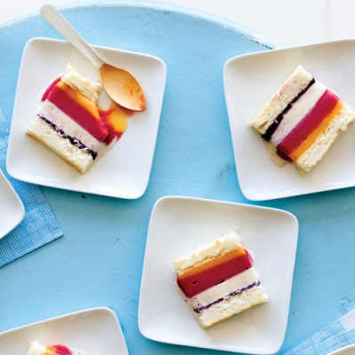 Spread raspberry sorbet over ice cream layer. Freeze until firm, about 2 hours. Spread peach sorbet over raspberry layer; top with remaining angel food cake. Wrap in plastic wrap; freeze overnight.
