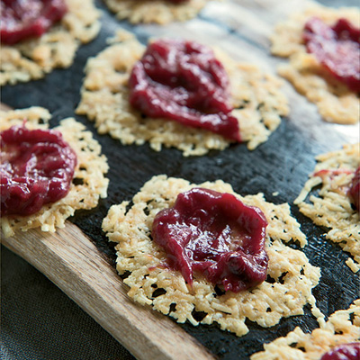 Fruit chutney is a popular accompaniment to serve with cheese plates, but in this creative twist, the cheese is transformed into crispy crackers and topped with a sweet, spiced rhubarb-and-cherry chutney.